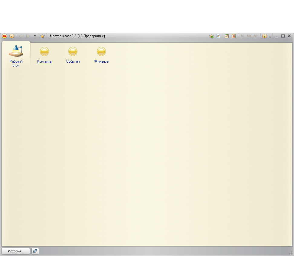 После небольшого ожидания система запустится в режиме ^Предприятие. Мы увидим пустое основное окно нашей программы, на которой уже платформой "1С:Предприятие 8.2" будет создано четыре раздела: один которых - Рабочий стол, а три остальных по названиям соответствуют "еденным нами ранее подсистемам - Контакты, События и Финансы.