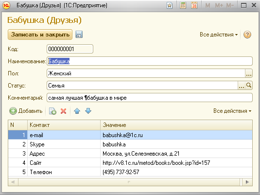 Тут надо учесть один момент. Если мы создадим пару "контактных" реквизитов там же, где делали это только что, то в один момент времени для одного знакомого сможем сохранить только один контакт - ведь все реквизиты, которые мы добавляли до этого времени, относятся к одному элементу (записи) справочника.
