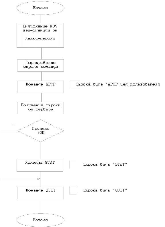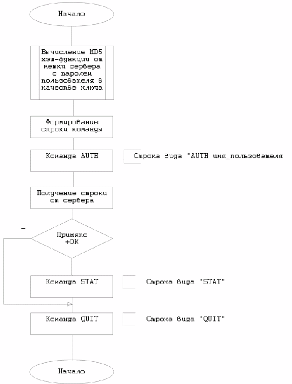 Если пользователем был выбран тип аутентификации с использованием бесключевой хэш-функции MD5, то алгоритм программы переходит к выполнению данной процедуры. В данном виде аутентификации используется строка, которая была получена из основной части алгоритма. На втором шаге алгоритма функции apop производится склеивание полученной строки метки времени сервера с паролем пользователя. После этого производится вычисление MD5 хэша от этой строки. После этого формируется строка для команды APOP. Эта строка имеет следующий вид: «APOP имя_пользователя хэш-функция». После того, как эта строка сформирована, она отправляется серверу. После этого программа переходит в состояние ожидания ответна от сервера. После получения строки с ответом сервера производится ее разбор. Если строка содержит начальную подстроку –ERR, то аутентификации е пройдена и производится отправка серверу строки с командой QUIT и выход из программы. Если строка содержит начальную подстроку +OK, то значит аутентификация пройдена успешно и программа переходит в операционную фазу. В этой фазе серверу отсылается команда STAT и после этого команда QUIT. После этого производится разрыв связи с сервером и завершение программы.