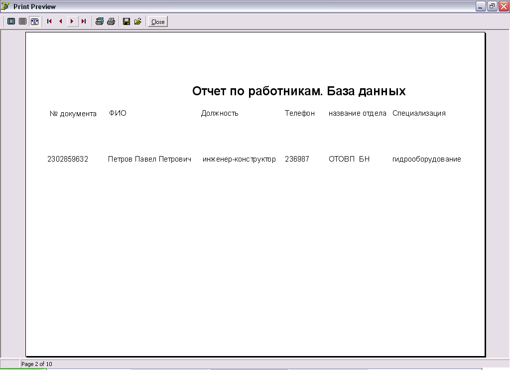 При выборе подменю отчет выведется информация о каждом работнике (рис. 4). На каждой странице – информация об одном человеке.