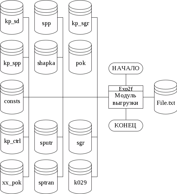 Для выгрузки данных в текстовом формате комплекса «Налогоплательщик ЮЛ» для государственной налоговой инспекции используются ранее созданные базы данных kp_sd, kp_spp, spp, kp_sgr, sgr, xx_pok, pok, consts, k029, kp_ctrl, shapka, sptran, sputr, информация в которых организована в виде DBF-файла.
