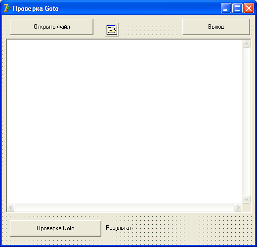 Кнопка buProverka выполняет непосредственную проверку правильности использования безусловного оператора (строки 43 - 94). На первом шаге происходит запись содержимого файла в строковую переменную sFile (строка 48). Затем, при условии что файл не пустой (строка 49), происходит циклический поиск подстроки “goto” в переменной sFile (строки 52-54). Удаляется содержимое проверяемого файла до слова “goto” и выделяется имя метки перехода (строка 55). Имя метки должно удовлетворять требованию задания имени идентификатора. Для этой проверки используются строки 56-77. Затем ищется имя метки и символ «:» - это непосредственный переход на метку. В случае отсутствия такой подстроки выдается сообщение об ошибке (строки 78 - 84). В случаи успешной проверки использования одного безусловного перехода происходит инкрементирование счетчика и новый поиск конструкции goto (строки 85-86). По окончании проверки (в случае отсутствия ошибок) выдается число найденный инструкций безусловного перехода (строки 88-92).