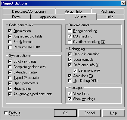 Debug Information. Опция контролирует включение отладочной информации. При отключении этой опции будет невозможно трассировать код или ставить точки прерывания в любом модуле. Опция эквивалентна директивам компилятора $D и $DEBUGINFO