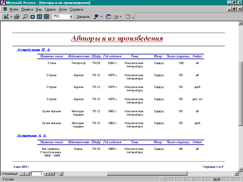 Количество – по одному значению для полей «Фамилия», «Имя», «Отчество», «Пол», «Дата рождения», «Дата смерти» и список имеющихся в библиотеке книг этого автора, с указанием их шифра, названия, отдела, где они расположены, жанра, темы, года создания, издательства, в котором они были изданы, года издания и количества страниц.