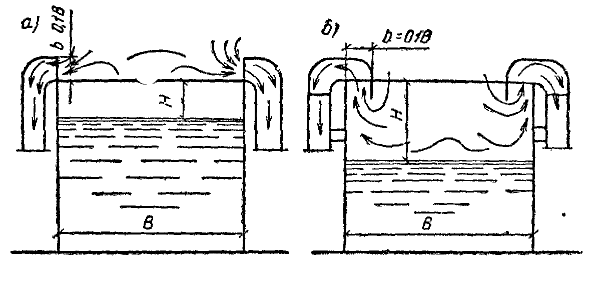 Б — безразмерная характеристика, равная для однобортового отсоса 0.35, а для двухбортового 0,5; р — угол между границами всасывающего факела, рад; Т>В> и Т>ПОМ> — абсолютные температуры соответственно жидкости в ванне и воздуха в помещении К.