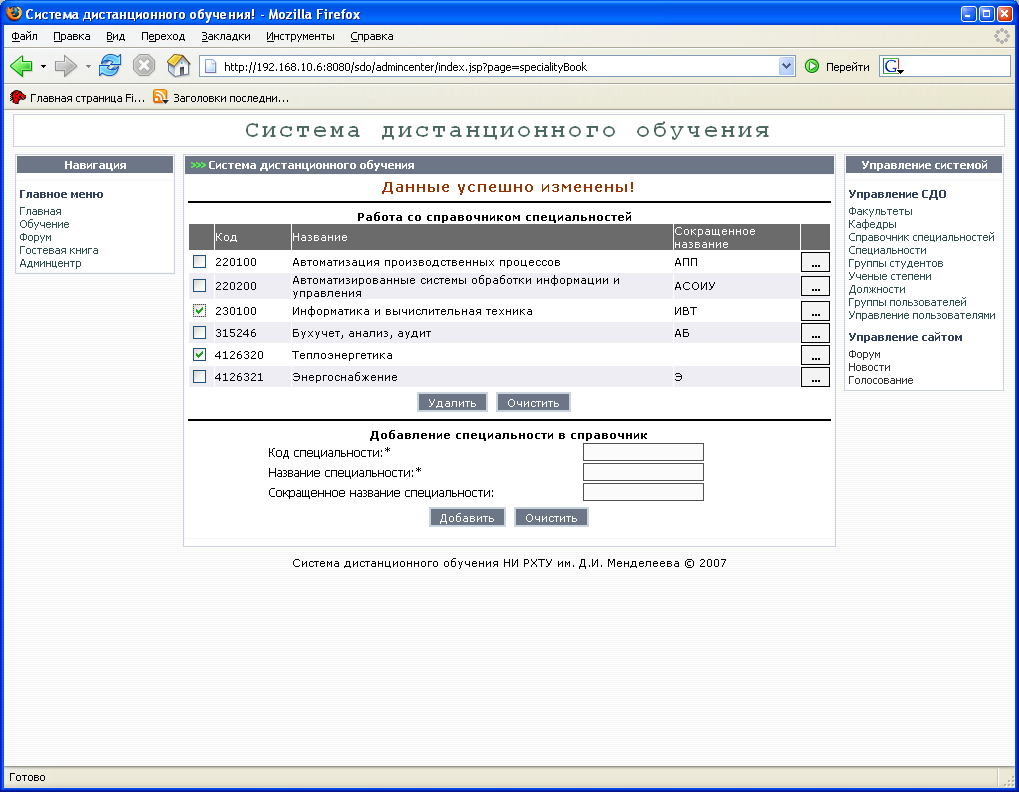 После создания групп администрирующих систему, необходимо приступить к ее администрированию. Рассмотрим процесс заполнения справочников на справочнике специальностей. Для этого выбирается в меню «Управление системой» «Справочник специальностей». В форму добавления вводятся «Код специальности», «Название специальности» и «Сокращенное название специальности». Поля, помеченные звездочкой, обязательны к заполнению. Если данные введены верно и еще не содержатся в таблице, то система подтвердит ввод сообщением (рисунок 2.5.2.3). В случае неправильного ввода, система выдает сообщение об ошибке.