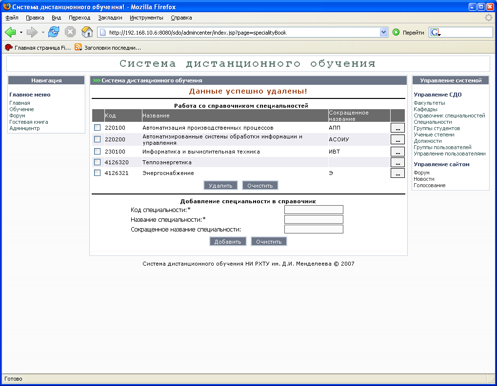 Экранные формы, отображающие процесс администрирования СДО представлены в Приложении К.