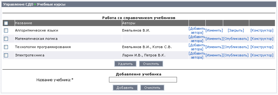 Для администрирующих пользователей будет доступен полный список учебников, а для авторов учебных курсов, только курсы, где они являются авторами.