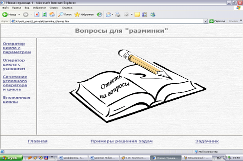 Во-вторых, нами был разработан электронный ресурс «Задачник по программированию. Циклические алгоритмы». Содержание цифрового ресурса отвечает принципу полноты: в нем содержатся теоретические вопросы для самоконтроля, практическая часть, задачи для самостоятельной работы.