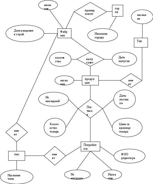 Объекты «Тип» - «Фабрика» и «Тип» - «Потребитель» связаны отношением 1: ∞, так как многие фабрики и потребители (магазины) могут иметь один тип. Объекты «Город» - «Фабрика» имеют отношение 1: ∞, так как несколько фабрик могут находиться в одном городе. Объекты «Фабрика» - «Продукция» имеют отношение ∞: ∞, так как многие фабрики могут выпускать разную продукцию. Объекты «Продукция» - «Потребитель» имеют тип связи ∞: ∞, так как многая продукция может поставляться в разные магазины.