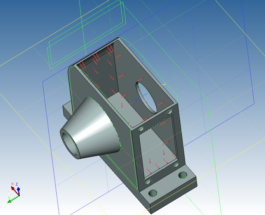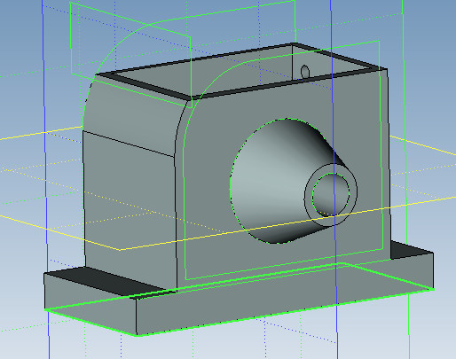 Для добавления заготовки, из которой будет изготавливаться (фрезерованием) деталь, будем использовать автоматический способ ее создания. Для этого выберем на главной инструментальной панели EdgeCam кнопку Auto-Stock. Переключать режим отображения заготовки с полупрозрачного на каркасный и обратно можно с помощью команды Toggle Stock. Результат показан на рис. 8.2.