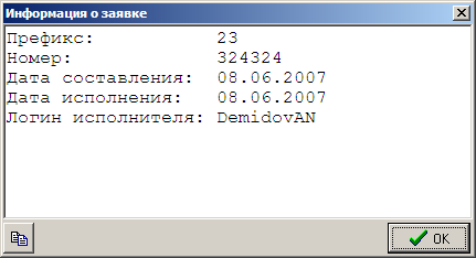 Пользователю остаётся нажать на кнопку «Исполнить заявку» на панели действий. После успешного внесения заявки в статусной строке внизу формы отображается соответствующее сообщение. Эта строка специально предусмотрена для этого.