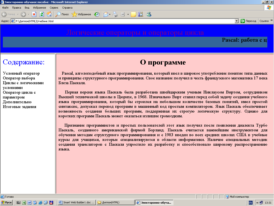 Разработку электронно-обучающего пособия "Pascal работа с циклами" было решено осуществлять на языке размещения гипертекста HTML, а в качестве визуального редактора языка HTML был выбран программный продукт Smart Web Builder, который, сочетая простоту, гибкость и качество разработки и обладая профессиональными средствами контроля кода, подходит как новичкам, так и профессионалам.