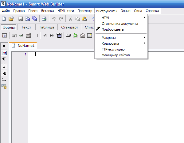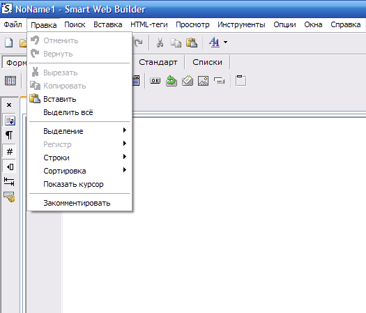 Пункты меню "Head", "Текст", "Таблицы", "Фреймы", "Списки", "Формы", "Нестандартные" позволяют осуществить быструю вставку всех основных тегов html в текущее окно редактирования.