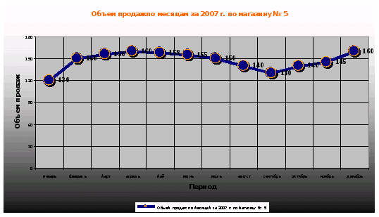 Название - Объем продаж по месяцам за 2007 г. по магазину № 5.