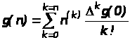 Относительно начала координат (i=0 - начало таблицы) функция целочисленной переменной g(n) представляется разложением по многочленам различных степеней от 0 до n. Для больших степеней конечные разности равны нулю.