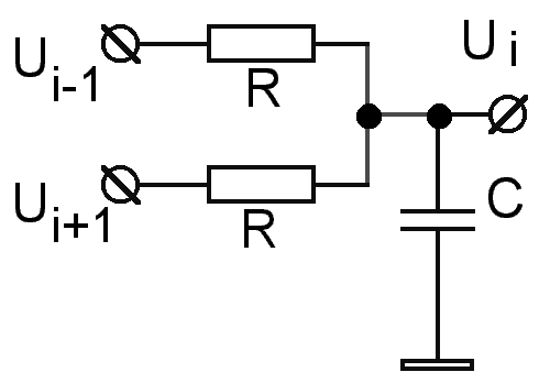 Соединив такие ячейки (аналоги дифференциальных уравнений системы) в последовательную электрическую цепь, мы получаем аналоговую модель дифференциального уравнения теплопроводности, которая изображена на рисунке 3.