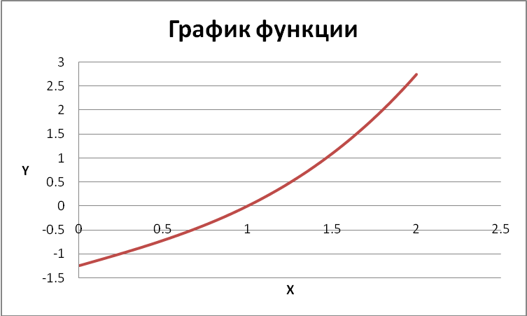 Как видно из рисунка график пересекает ось Х один раз, следовательно, на данном отрезке [ 0, 2] наше уравнение имеет один корень.