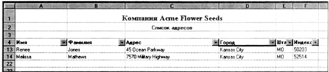 Після вибору всіх потрібних значень Excel покаже тільки ті записи, що містять у цьому полі обрані значення. Наприклад, на мал. 5 показано, що були відібрані тільки записи, в поле Штат яких зазначене МО, а в поле Місто – Kansas City. Для того щоб відібрати такі записи, не досить просто вибрати Kansas City зі списку поля Місто, оскільки місто з такою назвою є як у штаті Канзас, так і в штаті Міссурі. Якщо вказати кілька умов, яким повинні задовольняти значення у визначених полях записів, то після виконання команди Автофильтр залишаться тільки ті записи, що задовольняють заданим умовам.