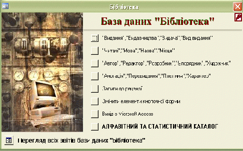 Використовуючи режим Конструктора для створення форм даної БД бібліотечного фонду “Тальнівського будівельно-економічного коледжу УДАУ” було оформлено 21 форму. Серед них головна форма (Рис.3.7) з якої можна перейти на інші форми - це форми по створеним таблицям БД “Розробники", “Мови”, “Місце”, “Читачі", “Автори", “Упорядники”, “Редактори", “Художники", “Перекладачі", “Розміщення”, “Видача", “Перевидання", “Плетіння", “Видання”, “Характери", “Назви", “Вид видання", “Видавництва", “Анотації" (Додаток Г, Д).
