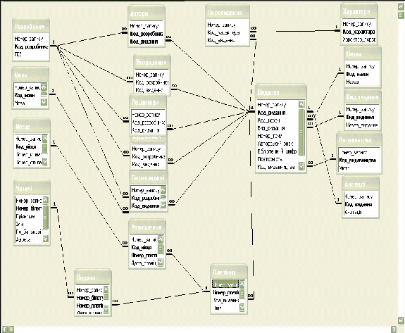 Використовуючи вище сказане для БД бібліотечного фонду проектується схема даних та встановлюються зв’язки між таблицями, які потрібні для подальшої роботи з створеною БД (Рис. 3.3).