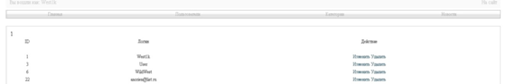 Користувачі. Цей розділ має наступний інтерфейс(рис.6) та надає можливість продивитися зареєстрованих користувачів, а також змінити їх реєстраційні дані, а також заблокувати їх.