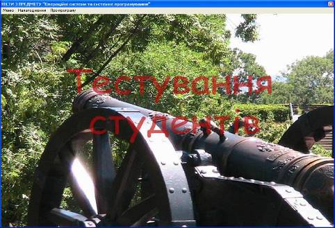 Запустивши програму на виконання ми побачимо головну форму програми, на якій розташоване головне меню з пунктами: «Меню», «Налагодження», «Про програму». Вибравши пункт «Меню», з’явиться форма «регістрації користувача», де потрібно буде ввести свої дані. Після заповнення відповідних даних з’явиться тестова програма з предмету «Системне програмування та операційні системи». Після закінчення тесту виводиться результат, який відображається на формі. Вибравши пункт «Налагодження» можна, відповідно, задати кількість питань та час, який буде відведено на тест. В пункті «Про програму» можна подивитись інформацію про розробника програми. Обравши підпункт меню «Вихід» ми закінчимо роботу з даною програмою.