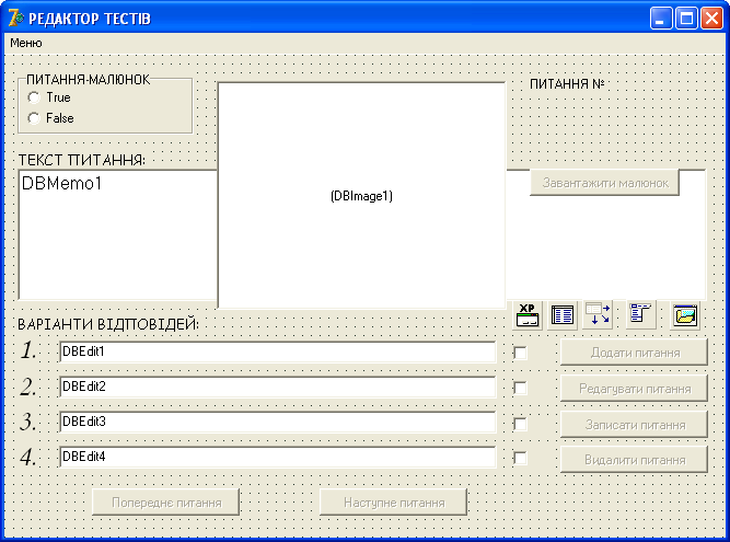 Для того, щоб відредагувати питання необхідно завантажити редактор тестів – файл TеstRЕDАСTОR.ехе. З меню вибрати пункт Завантажити тест. З’явиться діалогове вікно, де потрібно вказати пароль доступу (по замовчуванню – ‘tеst’, але його можна змінити). Після цього з’явиться форма, де можна буде додавати, редагувати, видаляти питання, натискаючи відповідні кнопки. Для виходу з редактора необхідно вибрати пункт меню – Вихід.
