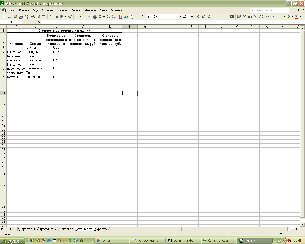 На рабочем листе Стоимость MS Excel создать таблицу, в которой будет содержаться стоимость выпечных изделий.
