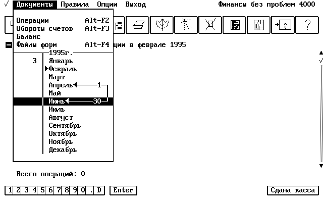 Меню "Финансов без проблем" двухуровневое. При выборе любого пункта "верхнего" меню "выпадают" зависимые подменю. "Подвигайтесь" по меню влево-вправо. Я думаю, не надо объяснять как выбрать ту или иную функцию. Обратите внимание, что напротив некоторых пунктов указана клавиатурная комбинация быстрого вызова данной функции. Запомним их: