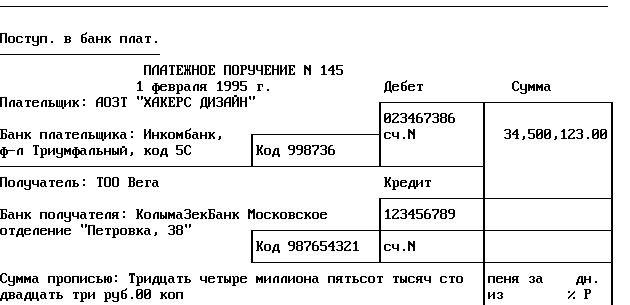 Последнее подтверждается следующим обстоятельством. Автору известно несколько компьютерных фирм в Москве, Петербурге, на Украине и в Беларуси прямо "позаимствовавших" у "Хакерс Дизайн" основные идеи "Финансов без проблем" и достаточно успешно тиражирующих свои разработки. Более того, идеи групповых или типовых операций, порождающих "одним махом" несколько проводок, специализированные генераторы отчетов, а также возможность оперативной "расшифровки" показателей оборотного баланса данными аналитического учета, впервые среди разработок для массового потребителя появившиеся в "Финансах без проблем", стали стандартом "де-факто" для систем автоматизации, поставляемых ведущими разработчиками компьютерных бухгалтерий. Так что, хотим мы того или нет - следует признать: разработчики "Хакерс Дизайн" во многом явились "законодателями мод" на рынке бухгалтерских программ практически на всей территории бывшего СССР.