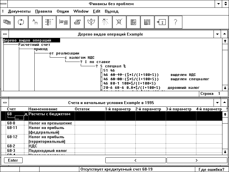 Теперь щелкните мышью на четвертой слева пиктограмме. На экране появится окно плана счетов и начальных условий. Так же, как и в предыдущем окне обследуйте его мышиным курсором, останавливаясь на экранных изображениях. Убедитесь, что перечисленные выше три задачи решаются здесь точно также.