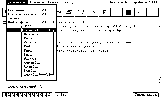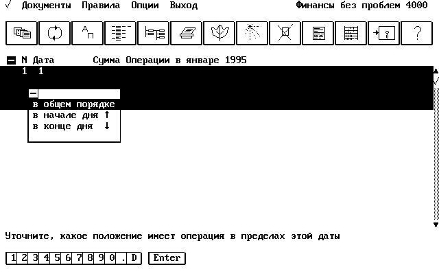 Однако, прежде чем это будет сделано, вызвав помощь познакомьтесь со списком активных клавиш, используемых при работе с реестром операций. Ознакомившись, нажмите F7, Insert или щелкните мышью на пиктограмме "Создание нового объекта". На экране появится поле ввода даты операции в котором отобразится значение 1. Обратите внимание, что в заголовке окна реестра операций написано "Операции в январе 1995" (... 1996, 1997 смотря какой год ныне "на дворе", то есть в системной дате компьютера). В дальнейшем мы научимся устанавливать нужный нам год и месяц выполнения операции, а пока оставим 1-ое число без изменений просто нажав Enter.