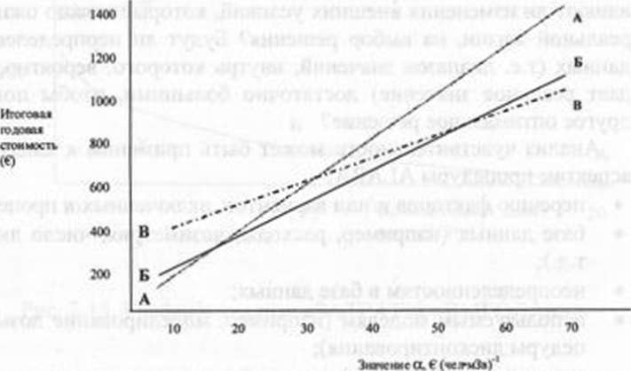 Для ускорения проведения анализа удобно пользоваться компьютерными программами. Написание таких программ имеет смысл для сложных задач. Графики и рисунки также могут быть полезны для иллюстрации влияния, которое параметры оказывают на результаты анализа. Например, на рис.2.16 изображен график влияния изменения значения параметра а на итоговую стоимость.