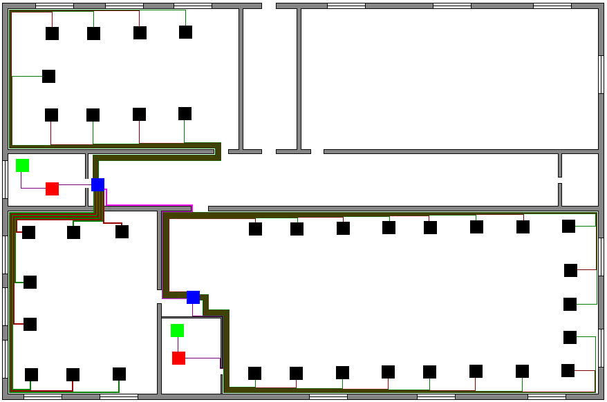 В данном помещении используется внутренняя и внешняя прокладка кабеля. Внутренняя прокладка осуществляется в коридоре внутри потолка под коммутационными панелями. Внешняя проводка проводится в самих комнатах с помощью коробов из пластика в 10 см над плинтусом. Огибание кабеля рядом с дверьми делается с помощью желоба.