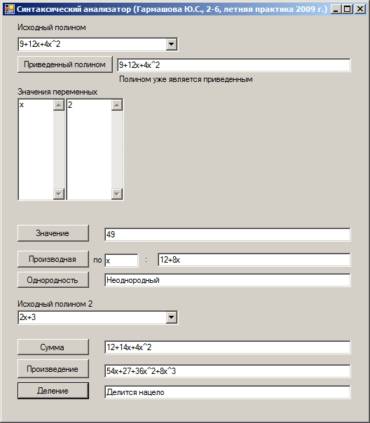 За время выполнения курсовой работы я ознакомилась с основами синтаксического анализа (на примере анализа полинома), с основами программирования на языке C#, приобрела опыт разработки визуальных приложений в среде MS Visual Studio 2005. Разработанная мною программа осуществляет синтаксический анализ полиномов, и, в частности, преобразует заданный полином к приведенному виду, вычисляет его значение, определяет, является ли полином однородным, находит его производную по заданной переменной, строит сумму и произведение двух заданных приведенных полиномов, определяет делимость одного полинома на другой без остатка.