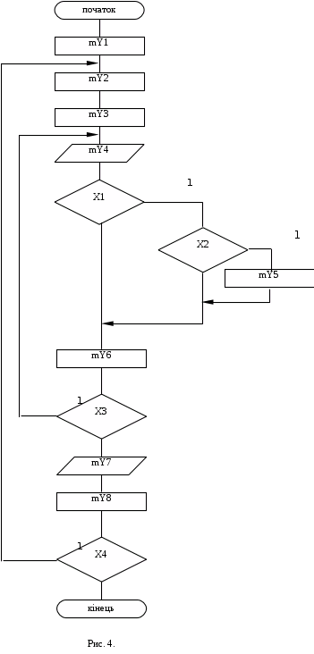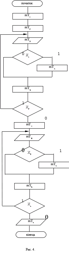Складаємо систему рівнянь виходів. Ця система складається на основі закодованої мікрокомандної схеми алгоритму (Рис.5), де Х - вхід,
