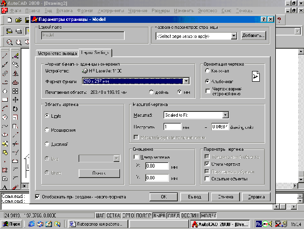 В якості одиниць виміру відстані використовуються міліметри. Хоча робота в середовищі AutoCAD, як і в більшості CAD-програм, передбачає використання реального масштабу, тобто 1: 1, а масштаб виводу зображення на твердий носій призначається тільки в процесі настройки опцій друку, тим не менше, в процесі роботи запропонований масштаб зовсім проігнорувати не можна. Необхідно раніше думати про величину таких елементів як відносно геометрії, які міститься на кресленні, так і відносно самого паперового листа.