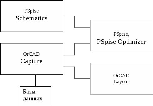 На рис.1 показано как OrCad Capture связан с другими программами системы OrCad.