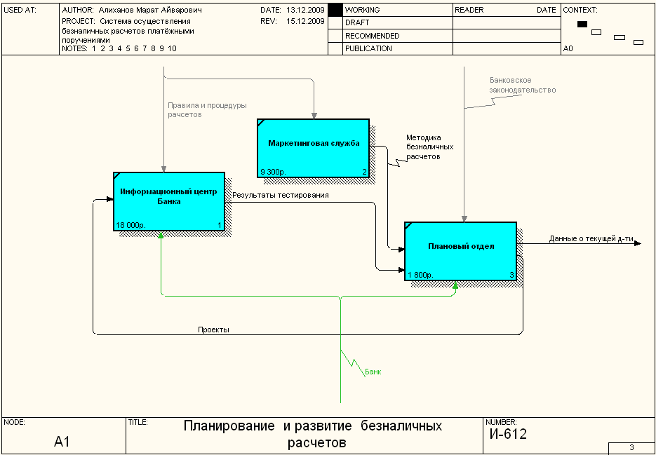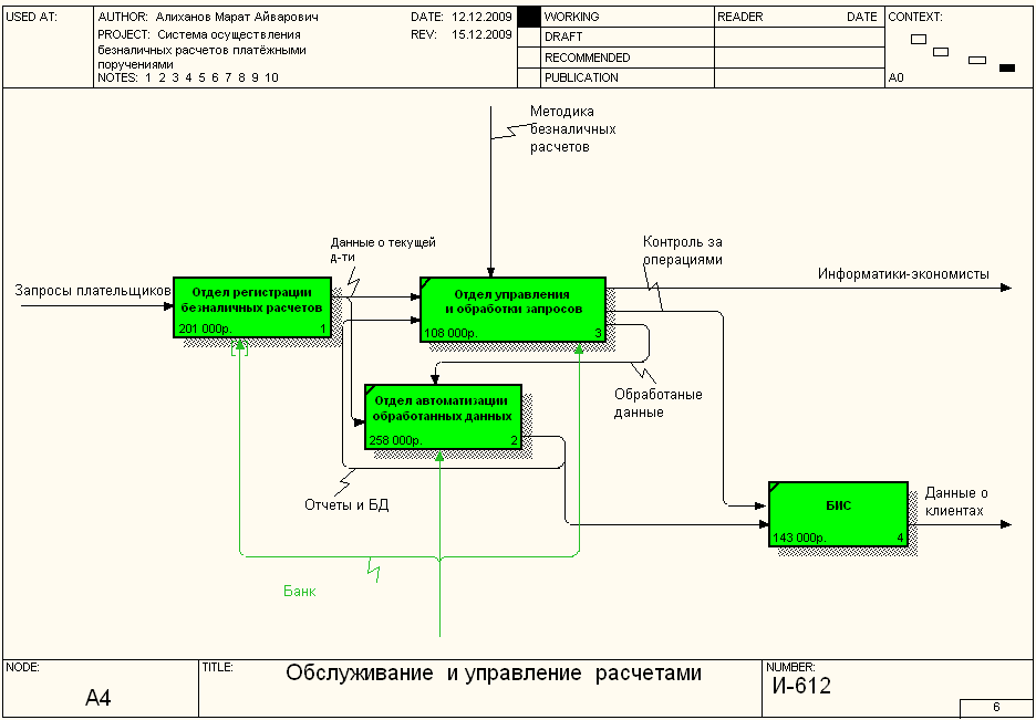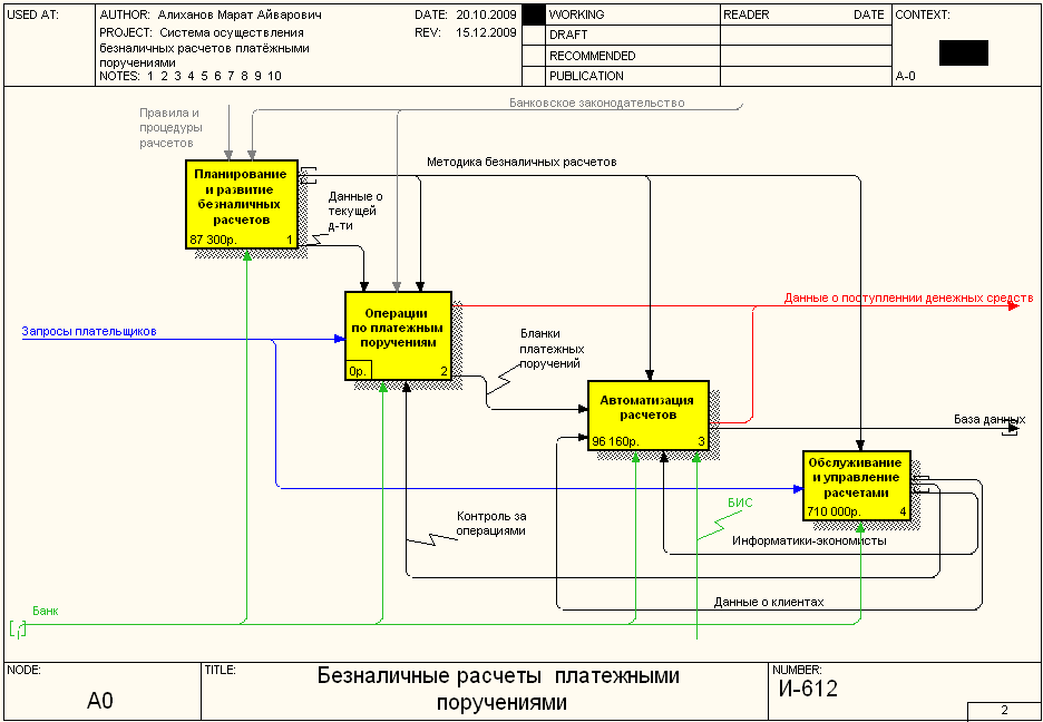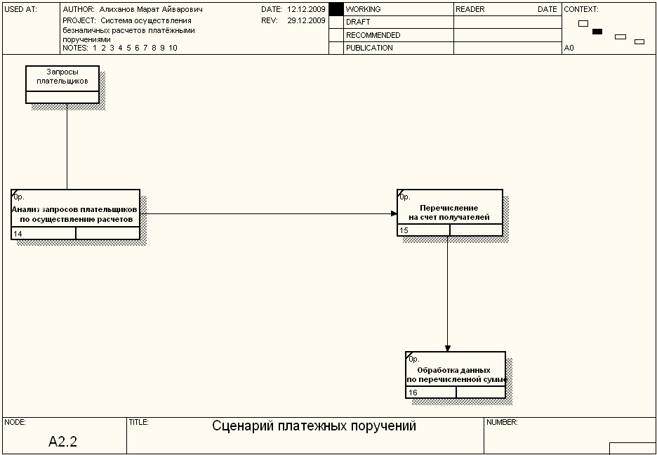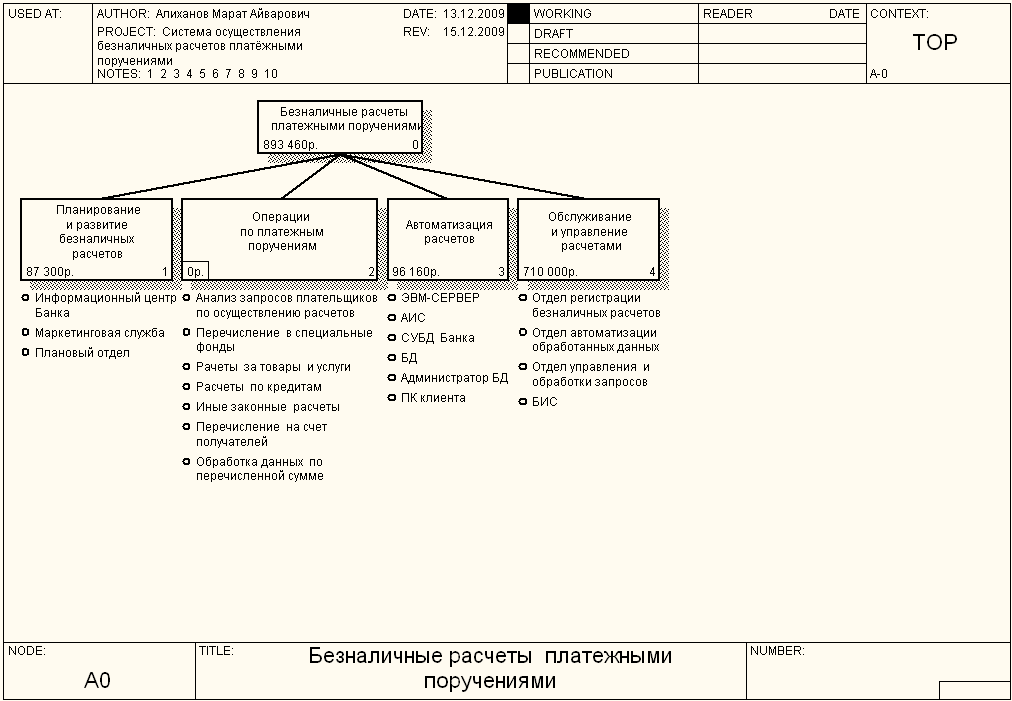 Контекстная диаграмма является вершиной древовидной структуры диаграмм и представляет собой самое общее описание системы и ее взаимодействия с внешней средой. Контекстные диаграммы изображают функционирование системы в целом. Контекстная диаграмма представлена единственной работой, изображающей систему в целом и названной соответственно создаваемому проекту "Безналичные расчеты платежными поручениями". Взаимодействие работ с внешним миром описывается в виде стрелок, которые представляют собой некую информацию и именуются существительными. Взаимодействие имеющейся на контекстной диаграмме работы описано стрелками типа: