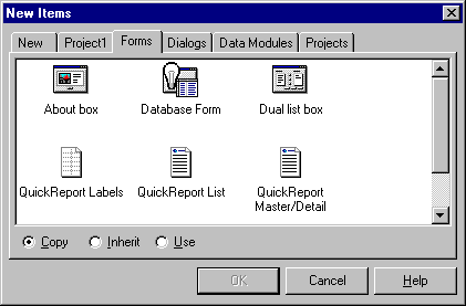 Для того чтобы добавить одну или более форм к проекту , выберите пункт меню File/New Form. Появится пустая форма, которая будет добавлена к проекту. Можно воспользоваться пунктом меню File/New, выбрать страницу Forms и выбрать подходящий шаблон из репозитория объектов.