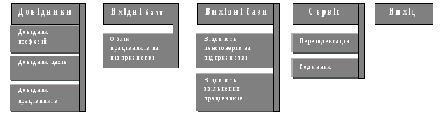Вихідні відомості формуються з попереднім запитом у вікні про відділ у 1-й відомості, про період і прізвище у 2-й відомості. Вони виводяться в рапорті у вигляді документу формату А-4 з усіма полями, які присутні в оперативній базі даних (додатково оформити поля в 1-й і 2-й відомостях, які є довіднику працівників — особові дані). Назва програмних файлів, які обробляють бази даних однойменні з dbf-файлів. Вихід здійснюється в середовище операційної системи. До довідника працівників створити вікно для добавлення і зміни запису.