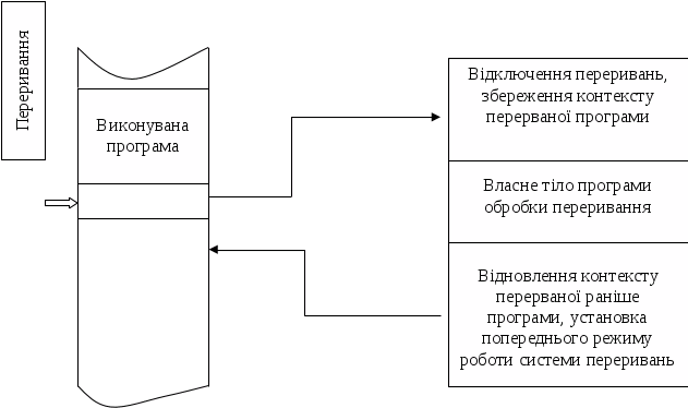 На мал.1 показано, що при виникненні запиту на переривання природний хід обчислень порушується і керування передається програмі обробки переривання. При цьому засобами апаратури зберігається (як правило, за допомогою механізмів стекової пам'яті) адреса тієї команди, з якою варто продовжити виконання перерваної програми. Після виконання програми обробки переривання керування повертається перерваній раніше програмі за допомогою занесення в покажчик команд збереженої адреси команди.