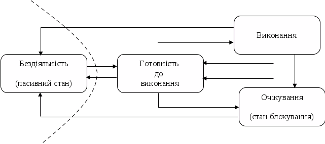 За час існування процес може багато разів переходити з одного стану в інший. Це обумовлено звертаннями до операційної системи с запитами ресурсів та виконання системних функцій, які надає ОС, взаємодією з іншими процесами, появою сигналів переривання від таймера, каналів і пристроїв введення/виведення, а також інших пристроїв. Можливі переходи процесу із одного стану в інший відображені у вигляді графа на мал. Розглянемо ці переходи з одного стану в інший більш детально.