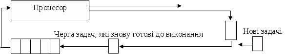 Дисципліна обслуговування RR припускає, що кожна задача одержує процесорний час порціями (квантами часу, q). Після закінчення кванта часу q задача знімається з процесора і він передається наступній задачі. Знята задача ставиться в кінець черги задач, готових до виконання. Для оптимальної роботи системи необхідно правильно вибрати закон, по якому кванти часу виділяються задачам.