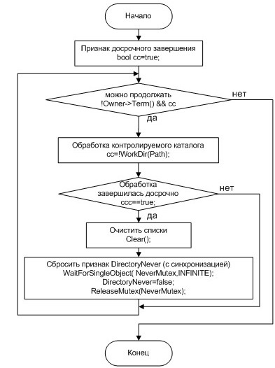 void __fastcall TDirThread::Execute() Это главная функция потока проверки файлов TDirThread. Первую проверку выполняет безусловно, последующие проверки - по взводу события NeverEvent (от потока контроля файлов TNotifyThread) |
