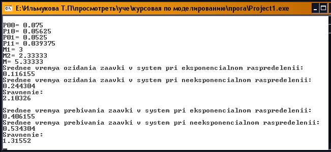 cout<<'\n'<<"Srednee vremya prebivania zaavki v system pri eksponencialnom raspredelenii: "<<'\n'<<tpreb1<<'\n'<<"Srednee vremya prebivania zaavki v system pri neeksponencialnom raspredelenii: "<<'\n'<<tpreb2<<'\n'<<"Sravnenie: "<<'\n'<<tpreb2/tpreb1<<'\n';