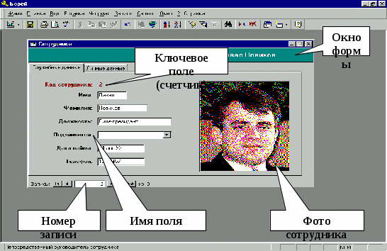 СУБД Access позволяет вводить в созданные экранные формы рисунки, узоры, кнопки. Возможно построение форм, наиболее удобных для работы пользователя, включающих записи различных связанных таблиц базы данных. Формы разрабатываются для интерактивной работы с данными, например, ввода новых данных, изменения имеющихся, удаления данных. Можно также назначить форму для выполнения поисковых процедур по получению данных, отвечающих интересующим вас критериям (найти курсантов, проживающих в определенном городе).