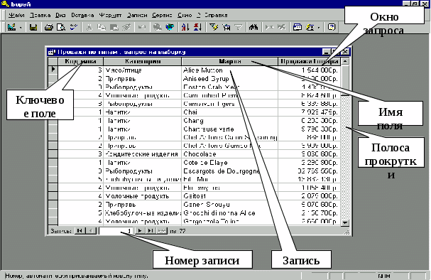 Результатом выполнения запроса является таблица с временным набором данных (динамический набор). Записи динамического набора могут включать поля из одной или нескольких таблиц базы данных.