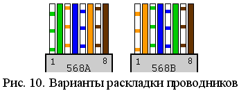 выбор за монтажником, важно, чтобы на обоих концах кабельного сегмента использовалась одна и та же раскладка проводников кабеля в вилках RJ-45.